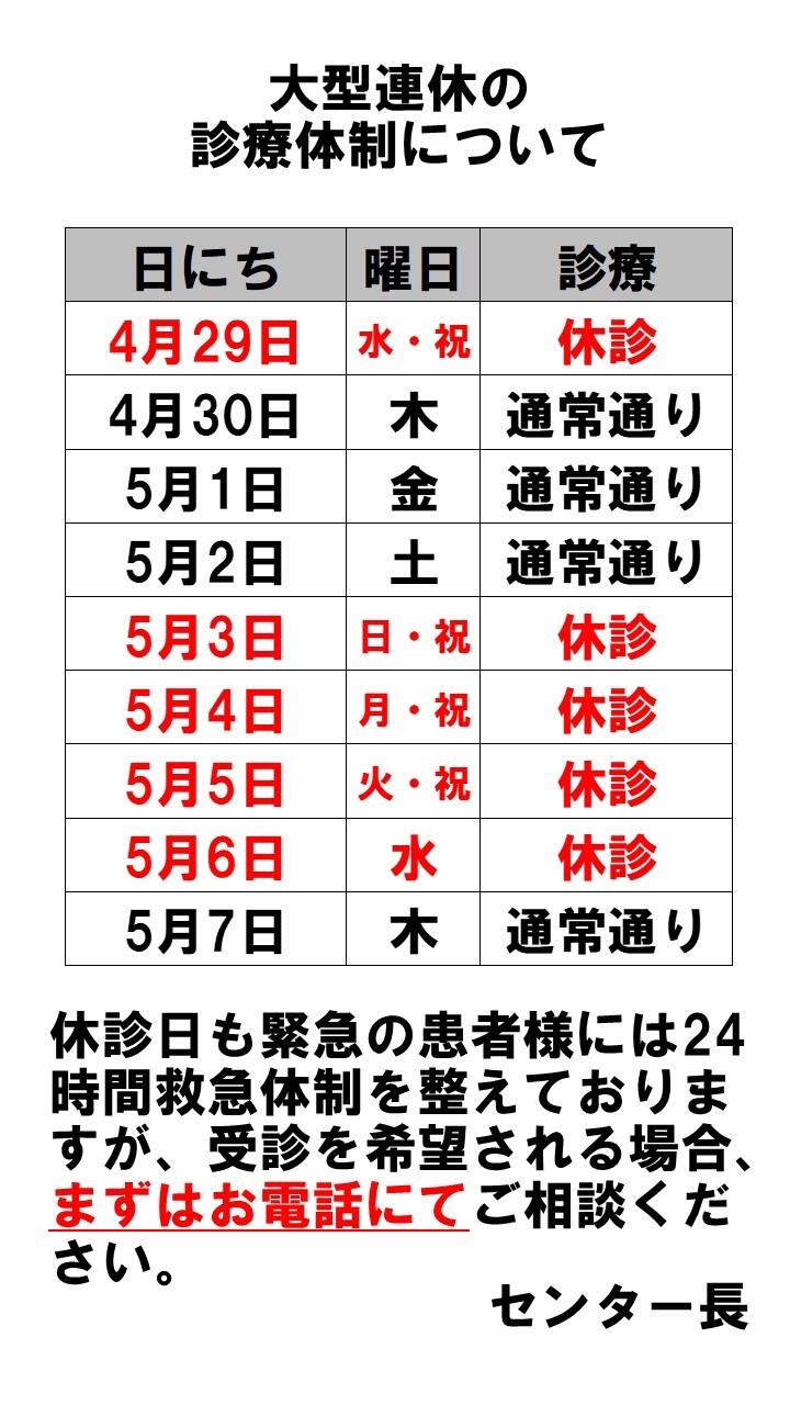一般 2026.04.18 ゴールデンウイーク休診のお知らせ 5月3日(日)から5月6日(水)は全診療科休診となりますが救急の患者様には対応しております。 当センターを救急で受診される際は、必ずお電話であらかじめご相談ください。 また、大変混雑が予想され、お電話に出られない事やお待たせする事がございます。ご了承ください。